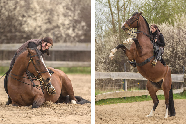 Besondere Fähigkeiten: beherscht Zirzensische Lektionen: Kompliment, Knien, Hinlegen, Spanischen Schritt, Steigen (sowohl vom Boden aus, als auch im Sattel), kann mit Halsring geritten werden, schreckfrei und scheufrei