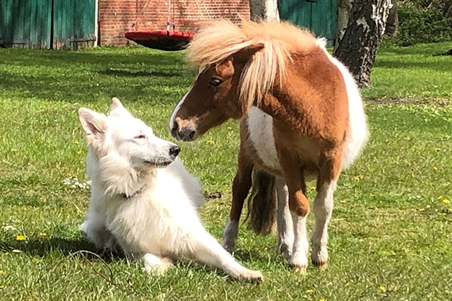 Dieses Minipony ist mit diversen Tieren verträglich. Für Filme wurde es bereits mit Hunden, Ziegen, Schafen und Kaninchen eingesetzt.