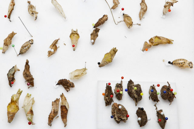 Schmetterlingspuppen, aus denen die Falter bereits geschlüpft sind, werden für Dokumentaraufnahmen genutzt oder in einem Fall sogar für ein Modefotoshooting.