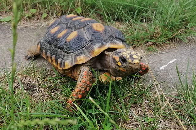 Nichts ist schlimmer, als wenn die Schildkröte beim Dreh in ihrem Panzer bleibt. Hier zeigen wir die lauffreudige Landschildkröt Gudrun.